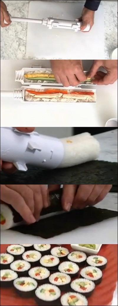 공개된 사진 속에는 주사기와 같이 생긴 제품을 이용해 간편하게 김밥을 만드는 과정이 담겨있다. 동그란 통에 밥과 재료를 넣고 밀어 넣으면 김밥 모양으로 밥과 재료가 뭉쳐져 나온다. 이후 김으로 둘러싸고 칼로 썰면 완벽한 김밥이 완성된다.