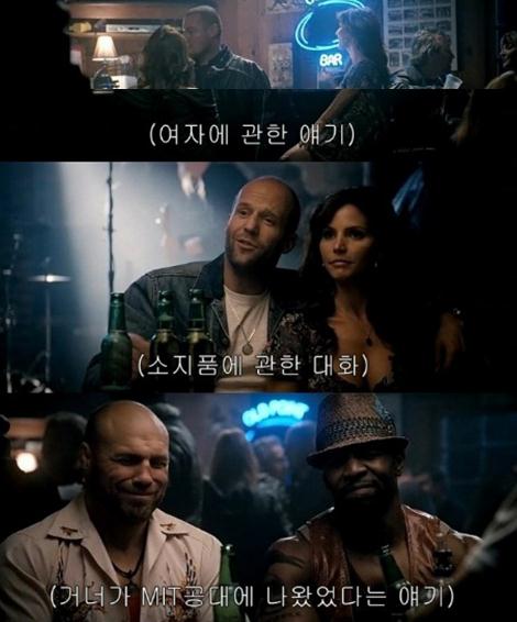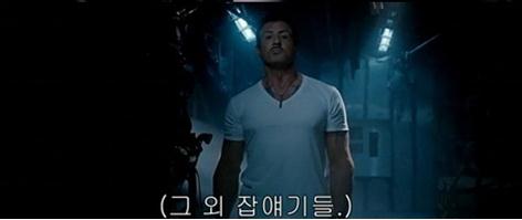 공개된 사진은 '익스펜더블2' 속 장면들로 한글 자막에는  '여자에 관한 얘기' '소지품에 관한 대화' '서로 소개하는 내용' '그 외 잡얘기들' 이라는 대충 자막이 삽입되어 있다.