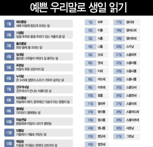 우리말로 생일을 읽어보면 1월 1일은 '해오름달 하루', 7월 17일은 '견우직녀달 열이레', 12월 25일은 '매듭달 스물 닷새' 표현되어 색다름을 주고 있다.