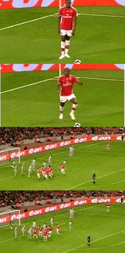 해당 영상에는 한 키커가 프리킥 찬스를 맞아 슈팅 모션을 취한 후 곧바로 멈추며 선수들을 속이는 장면이 담겨 있다.