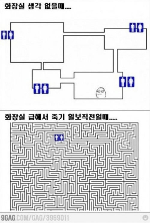 화장실 생각이 없을 때는 주위의 화장실이 잘 보이지만, 화장실이 급해서 죽기 일보 직전일 때는 아무리 둘러봐도 화장실이 안 보여 마치 미로와 같은 상황에 놓이게 된다는 상황 설명에 보는 이들의 공감을 자아내고 있다.