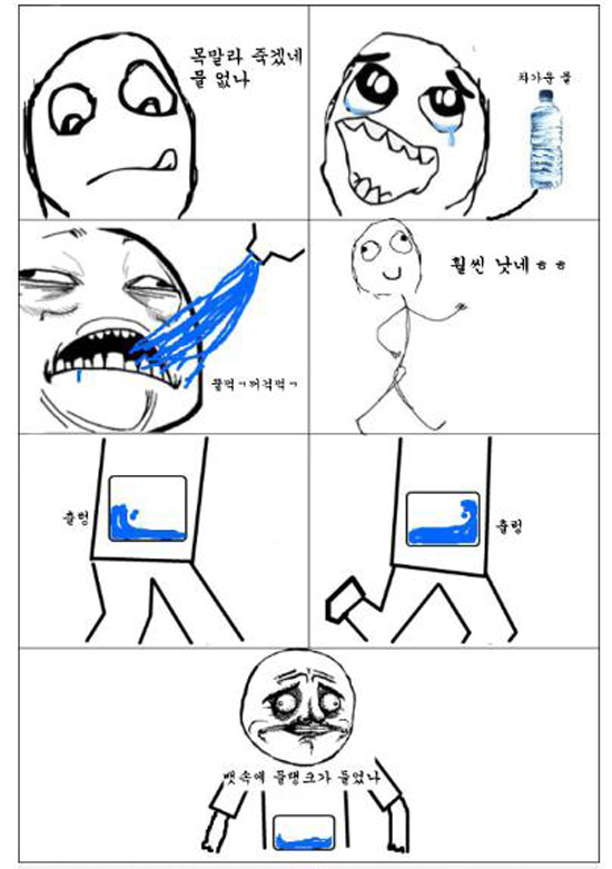 '배가 비었을 때 공감' 게시물을 살펴보면 먼저 갈증을 느낀 주인공이 차가운 물을 발견하고 눈물을 흘릴 정도로 기뻐하는 모습이 담겨 있다.