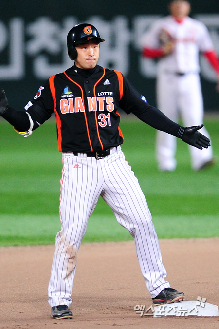[엑스포츠뉴스=문학, 권혁재 기자] 16일 오후 인천 문학구장에서 열린 2012 팔도 프로야구 플레이오프 1차전 SK 와이번스와 롯데 자이언츠의 경기에서 SK가 1-0으로 앞선 6회 롯데 손아섭이 동점 2루타를 날리고 환호하고 히따.
