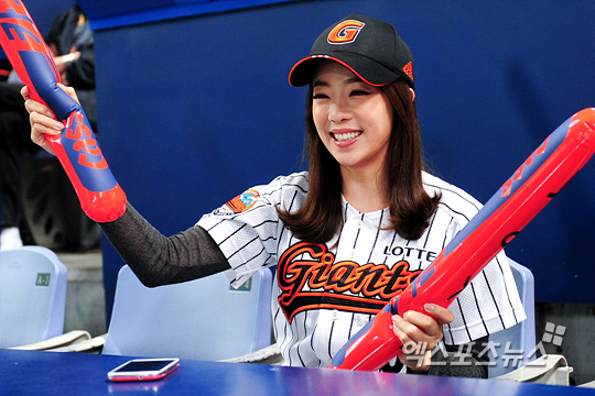 [엑스포츠뉴스=문학, 권혁재 기자] 16일 오후 인천 문학구장에서 열린 2012 팔도 프로야구 플레이오프 1차전 SK 와이번스와 롯데 자이언츠의 경기에서 KBS 박은영 아나운서가 롯데 유니폼을 입고 관중석에 앉아 경기를 지켜보고 있다.