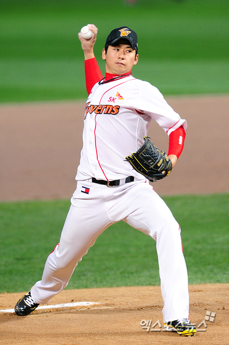 [엑스포츠뉴스=인천, 권혁재 기자] 17일 오후 인천 문학구장에서 열린 2012 팔도 프로야구 플레이오프 2차전 SK 와이번스와 롯데 자이언츠의 경기에서 1회 SK 선발투수 윤희상이 힘차게 공을 던지고 있다.