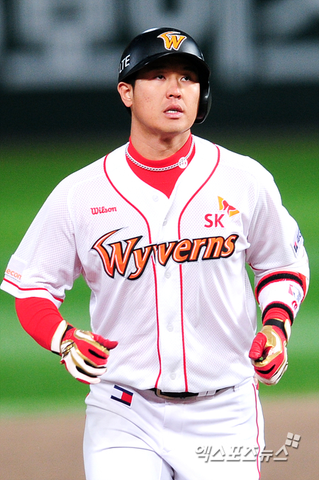[엑스포츠뉴스=인천, 권혁재 기자] 17일 오후 인천 문학구장에서 열린 2012 팔도 프로야구 플레이오프 2차전 SK 와이번스와 롯데 자이언츠의 경기에서 1회 1아웃 1루 SK 최정이 좌월 투런홈런을 날리고 그라운드를 달리고 있다.