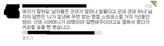 해당 게시물에는 "여자가 말하길 남자들은 군대가 얼마나 힘들다고 '군대 군대' 하냐는 말에, 남자의 답변은 "남자의 답변은 니가 일 년에 두 번 받은 명절 스트레스를 거의 1년 동안 받아. 근데 시어머니가 20명이야라고 답변해주더라"라고 정리했다.