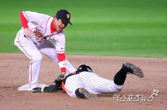[엑스포츠뉴스=문학, 권혁재 기자] 22일 오후 인천 문학야구장에서 열리 2012 팔도 프로야구 플레이오프 5차전 SK 와이번스와 롯데 자이언츠의 경기에서 SK가 3-2로 앞선 3회초 SK 정근우가 도루하는 롯데 황재균을 태그아웃 시키고 있다.