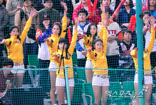 [엑스포츠뉴스=문학, 권혁재 기자] 22일 오후 인천 문학야구장에서 열리 2012 팔도 프로야구 플레이오프 5차전 SK 와이번스와 롯데 자이언츠의 경기에서 SK가 5-3으로 앞선 7회초 롯데 치어리더들이 열띤 응원을 펼지며 타석을 바라보고 있다.