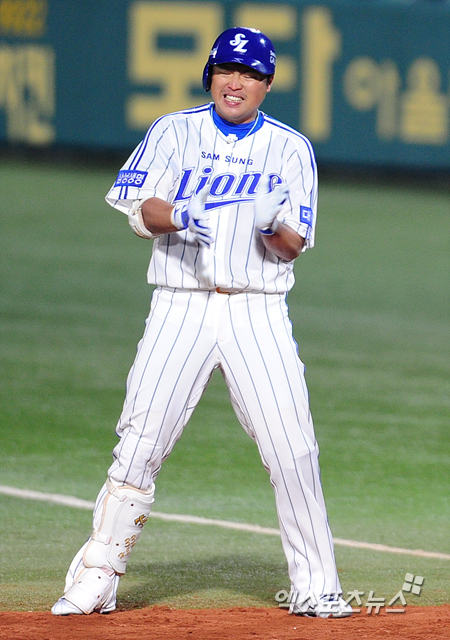 [엑스포츠뉴스=대구, 권혁재 기자] 24일 오후 대구 시민구장에서 열린 2012 팔도 프로야구 한국시리즈 1차전 삼성 라이온즈와 SK 와이번스의 경기에서 삼성이 2-1으로 앞선 6회말 2아웃 1, 2루 삼성 박한이가 중견수 왼쪽 안타에 2루주자 이승엽이 홈까지 들어가지 못하자 아쉬워 하고 있다.