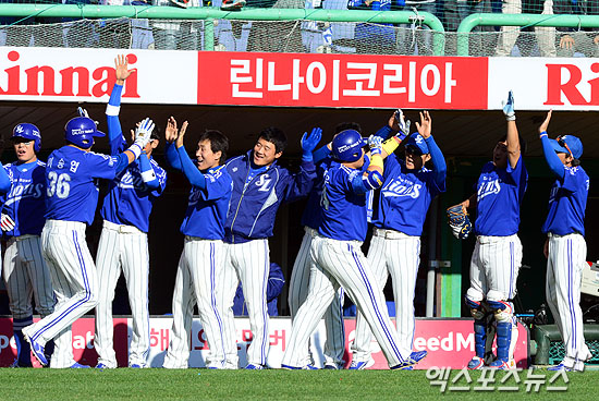 [한국시리즈 3차전] '최형우 쓰리런에 신이 난 삼성 덕아웃'[포토]