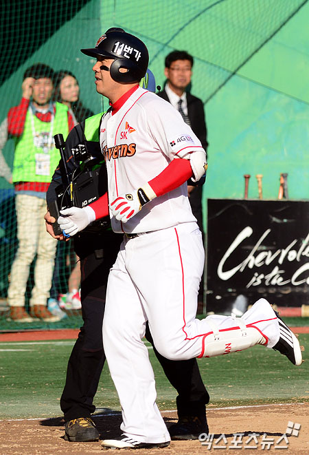 [엑스포츠뉴스=문학, 김성진 기자] 28일 오후 인천 문학야구장에서 열린 2012 팔도 프로야구 한국시리즈 3차전 SK 와이번스와 삼성 라이온즈의 경기에서 4회 말 무사의 상황에서 선두타자로 나선 박진만이 배영수로부터 솔로 홈런을 터뜨린 뒤 홈을 밟고 있다.