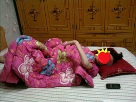 사진에는 침대에서 가로로 자는 것은 물론이고, 한여름에 죽부인을 옆에 놓고 이불을 둘둘 말고 자고 있는 모습이 담겨 있다.