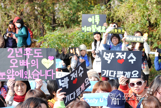 이날 수많은 팬들이 응원문구가 적힌 피켓을 들고 이특의 입대를 응원하기 위해 모여있다.