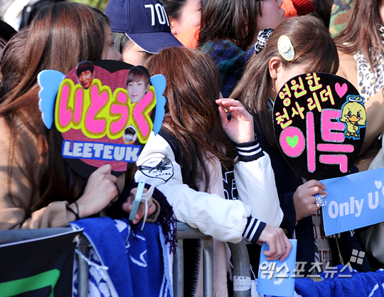 이날 수많은 팬들이 응원문구가 적힌 피켓을 들고 이특의 입대를 응원하기 위해 모여있다.