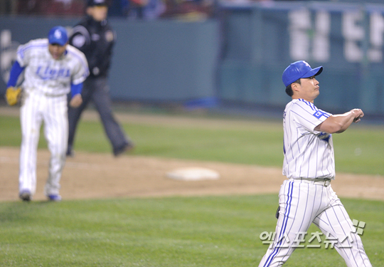 [한국시리즈] '세레모니 하는 오승환 뒤로 포효하는 이승엽'[포토]