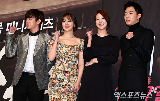 [엑스포츠뉴스 = 김성진 기자] 1일 오후 서울 중구 소공동 롯데호텔에서 열린 MBC 새 수목드라마 ‘보고싶다’ 제작발표회에 유승호, 윤은혜, 장미인애, 박유천(왼쪽부터)이 화이팅을 외치고 있다.