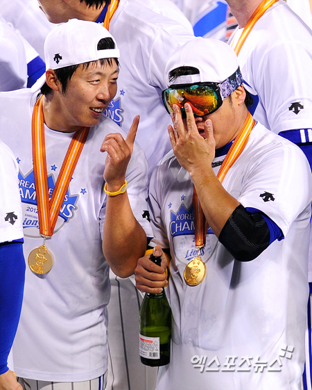 삼성 배영수가 샴페인 세례를 위해 고글을 착용한 박석민과 대화를 하고 있다.