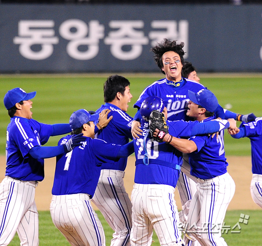 우승이 확정되자 삼성 선수들이 마운드에 모여 서로 얼싸안고 기뻐하고 있다.