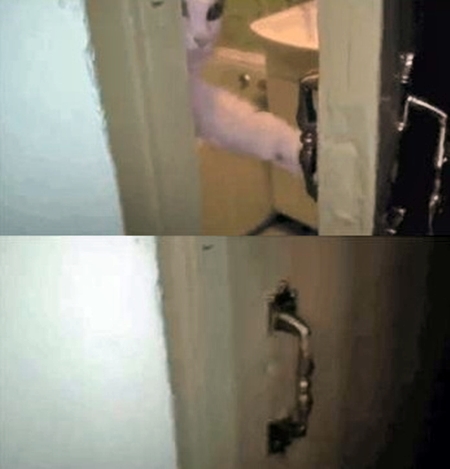 영상 속에는 문틈 사이에서 카메라를 주시하고 있는 고양이의 모습이 담겨 있다.