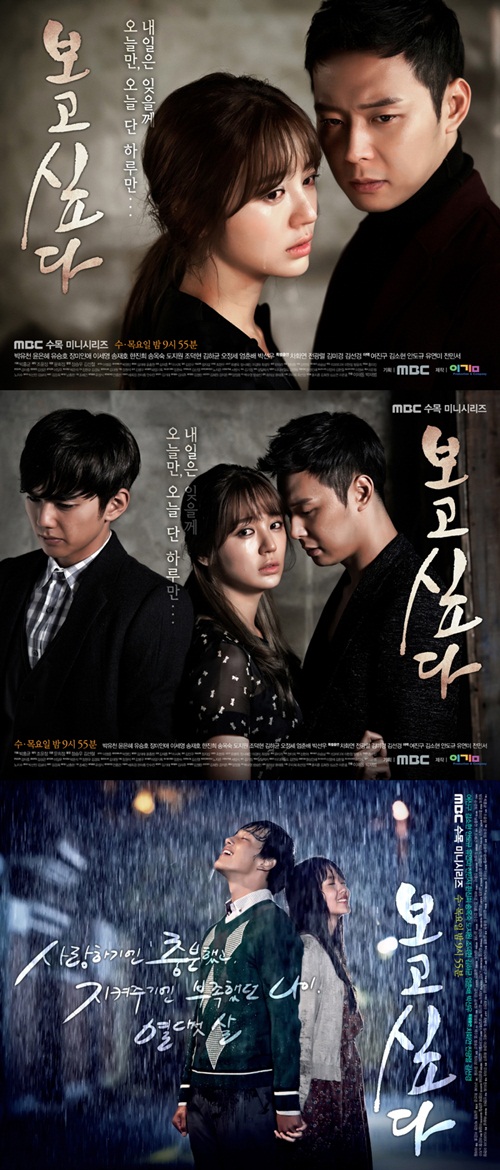 7일 MBC 새 수목드라마 '보고싶다'의 최종 포스터 세 장이 공개됐다. 두 장은 성인 연기자들 박유천, 윤은혜, 유승호의 모습을 담고 있고, 한 장은 그들의 어린 시절을 연기할 여진구 김소현의 모습을 담았다.