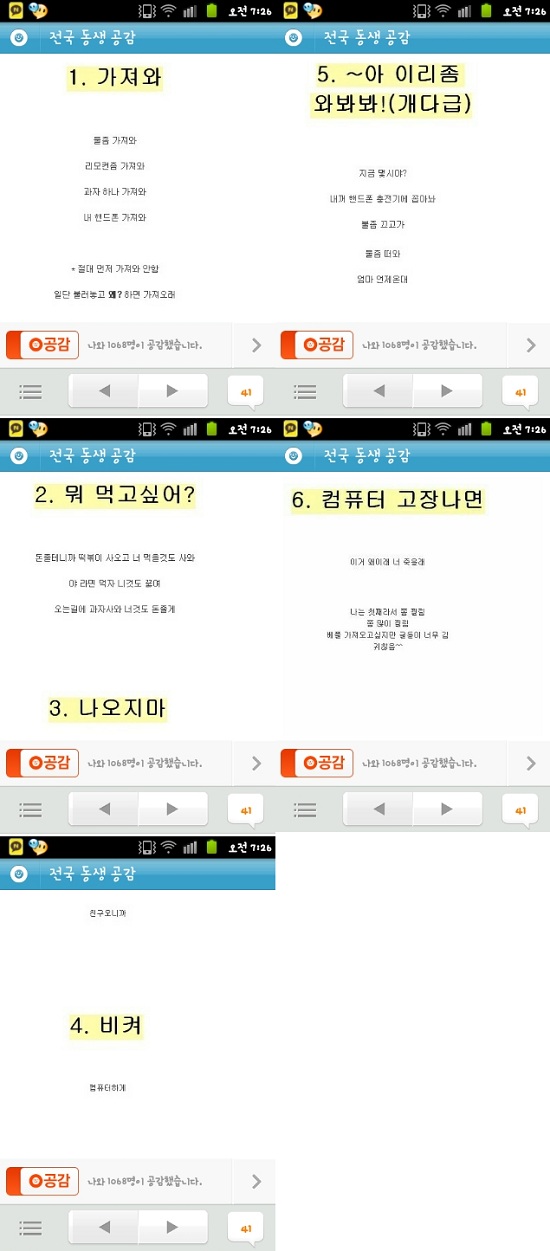 공개된 '전국 동생 공감' 게시물에는 동생들이 공감할 만한 상황들이 간단한 예시로 설명되고 있다.