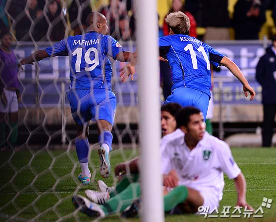 [엑스포츠뉴스 = 울산, 김성진 기자] 10일 오후 울산 남구 옥동 울산문수축구경기장에서 열린 '2012 AFC 챔피언스리그 결승전(AFC Champions League Fanal)' 울산 현대와 알 아흘리의 경기에 쐐기골을 넣은 하피냐(왼쪽)가 이근호와 함께 세레머니를 하고 있다.