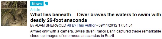 최근 영국 데일리메일 등 외신들은 스위스의 사진작가 프랑코 반피가 최근 브라질 아마존의 한 숲에서 몸길이 8m에 육박하는 괴물 아나콘다 사진을 찍은 사연을 보도했다.