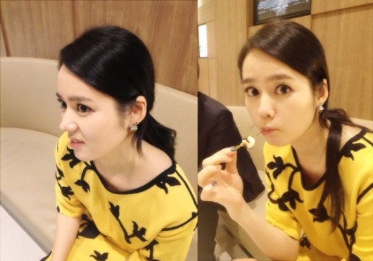 공개한 사진 속 한가인은 노란색 원피스를 입고 단정하게 머리를 묶은 채 소파에 앉아 있다. 한가인은 한 곳을 노려보며 인상을 쓰고 있는 표정이지만 뚜렷한 이목구비는 그대로다.