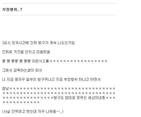 이는 방귀 때문에 '기발한 부정행위'로 오해당한 학생의 에피소드로 "시험시간에 계속 방귀가 나와 리듬을 타며 방귀를 뀌었더니 시험을 감독하던 선생님이 다가와 '지금 부정행위 하냐'고 말했다"는 내용이 담겨 있다.