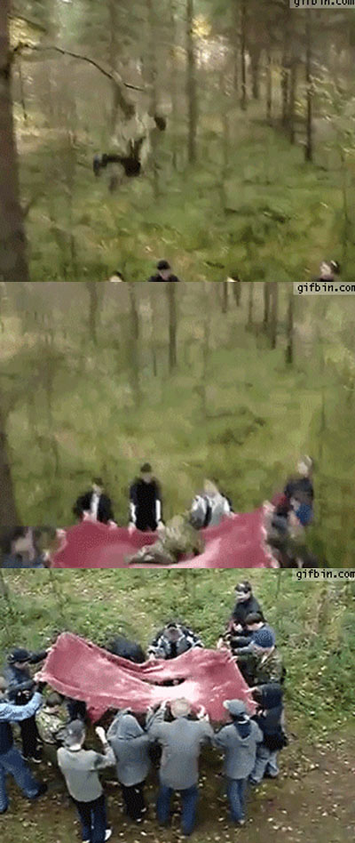 나무 아래에는 그가 안전하게 떨어질 수 있도록 동료들이 분홍색 담요 한 장을 넓게 펼치고 있다.
