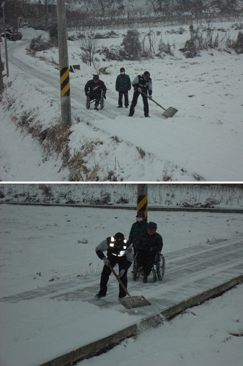 글쓴이는 지난 7일 갑작스럽게 내린 눈으로 순식간에 길이 막혀 꼼짝할 수 없었던 휠체어를 탄 장애인 아들과 노모를 위해 한 경찰관이 눈을 치워줬다고 설명했다.