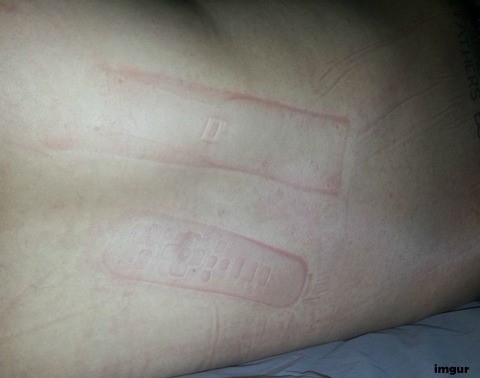 자세히 보면 등에 새겨진 붉은색 무늬는 리모컨 자국으로, 등 밑에 리모컨을 깔고 잠을 자다가 생긴 것으로 보인다. 등이 아팠던 이유를 고스란히 보여주는 자국이 보는 이들의 웃음을 자아낸다.