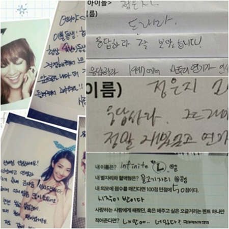 먼저 공개된 걸그룹 씨스타의 효린과 다솜의 글씨체는 깔끔하면서도 나이에 맞는 산뜻함이 느껴진다. 그룹 인피니트의 멤버 엘 역시 남자임에도 귀여운 글씨체로 주목을 받았다.