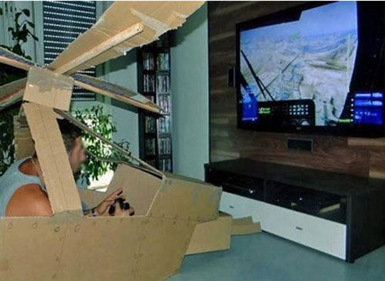 공개된 사진 속에는 한 남성이 헬리콥터 모양으로 만든 박스 안에서 비디오 게임에 열중하고 있다.
