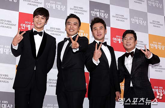 [엑스포츠뉴스 = 김성진 기자] 22일 오후 서울 영등포구 여의도동 여의도 KBS홀에서 열린 ‘2012 KBS 연예대상’에 1박2일 팀(왼쪽부터 주원, 김승우, 엄태웅, 이수근)이 포즈를 취하고 있다.