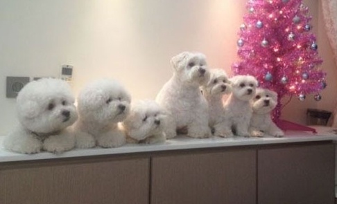 사진 속에는 가구 위에 나란히 앉아있는 7마리 강아지의 모습이 담겨 있다.