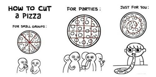 이에 따르면 적은 인원이 피자를 먹을 때는 피자를 8조각으로 자르면 된다. 많은 인원이 있을 경우에는 피자를 바둑판 모양으로 자르면 여러 조각이 나온다.