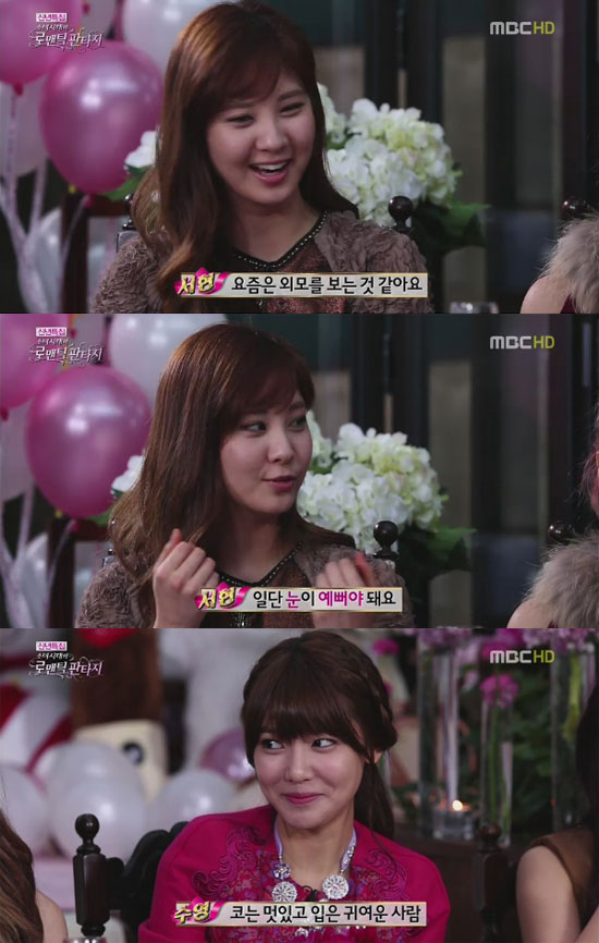서현은 "이전까지는 외모를 안 보는 편이었다"며 "그런데 요즘은 외모를 보는 것 같다"고 솔직하게 고백했다. 이어 "일단 눈이 예뻐야 한다"고 자신의 이상형에 대한 바람을 늘어놓았다.
