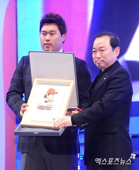 [엑스포츠뉴스=대전, 사진부 권혁재 기자] 5일 오후 대전 한밭 종합운동장 내 한밭체육관에서 열린 '류현진 MLB 진출 기념 환송회'에서 '괴물' 류현진이 한화 이글스 정승진 대표로부터 감사품을 전달받고 있다.