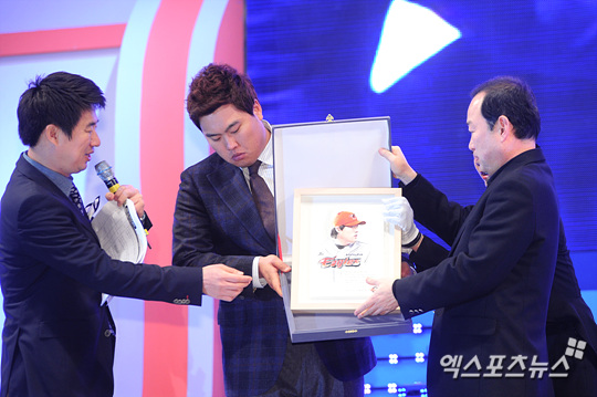 [엑스포츠뉴스=대전, 사진부 권혁재 기자] 5일 오후 대전 한밭 종합운동장 내 한밭체육관에서 열린 '류현진 MLB 진출 기념 환송회'에서 '괴물' 류현진이 한화 이글스 정승진 대표로부터 감사품을 전달받고 있다.