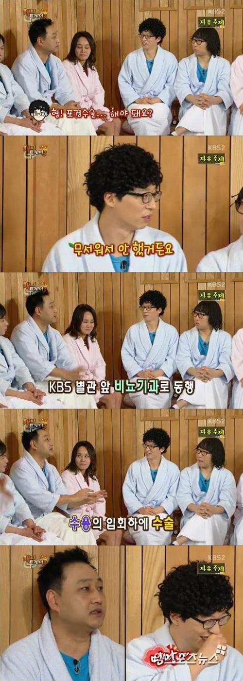 바로 유재석을 데리고 포경수술을 했던 사연을 털어놓은 것. 이에 당황한 유재석은 "어릴 때 무서워서 안 했다"면서 김수용의 토크에 모든 걸 내려놓는 모습을 보였다.