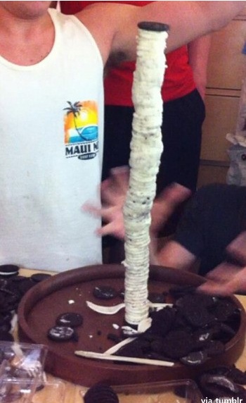 게시자는 "화이트 크림이 들어 있는 샌드위치형 쿠키를 듬뿍 샀다. 먹으려고 산 것은 아니다. 즐거움을 위해 돈을 썼다. 친구들과 모여 과자를 조심스럽게 하나하나 분리하고 붙였다. 곧 쿠키 하얀 거탑이 쌓아 올려졌다. 우리는 박수를 치고 행복을 맛봤다"고 전했다.
