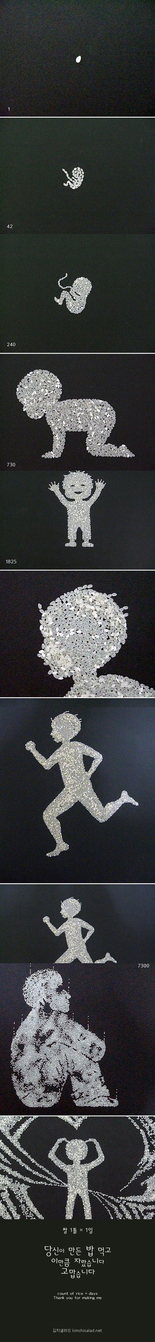 해당 게시물에는 한 톨의 쌀이 점점 모여 태아가 되고 아이가 되는 모습이 담겨 있다.