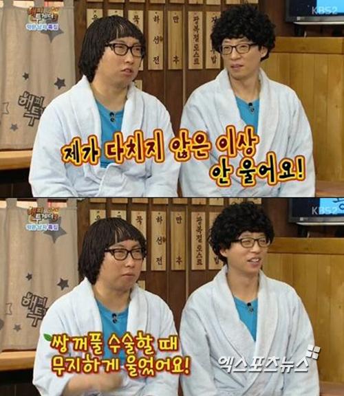 박명수는 "난 내가 다치지 않은 이상 안 운다. 쌍꺼풀 수술할 때 너무 많이 울었다"고 고백해 웃음을 자아냈다.