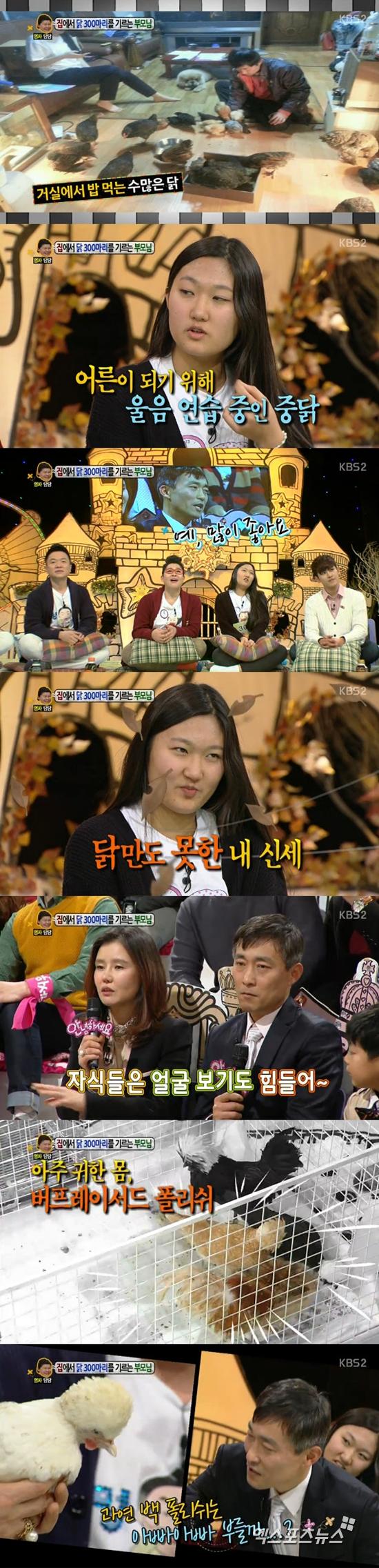4일 오후 방송된 KBS 2TV '안녕하세요'에 등장한 사연의 주인공은 "부모님이 닭을 너무 좋아하신다. 집안에서 서른 마리를 키우고, 집 근처에서 나머지 닭을 기른다"라며 서러움의 눈물을 보였다.