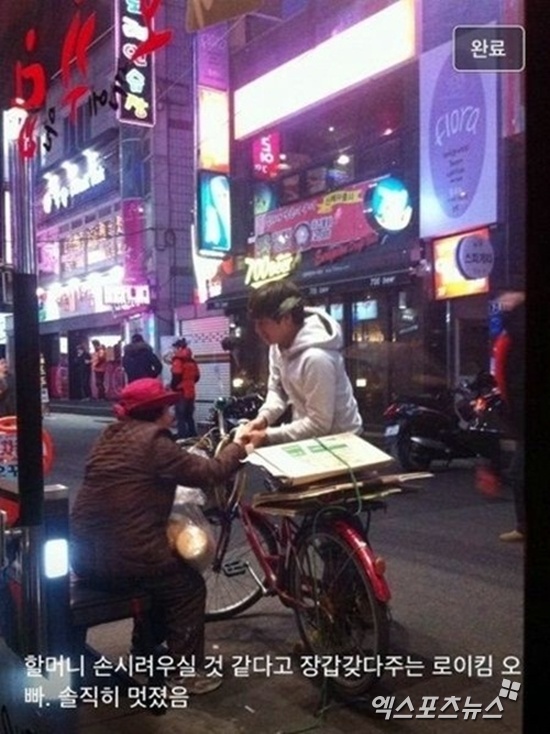 최근 SNS와 온라인 커뮤니티에 '로이킴 선행'이라는 제목으로 사진이 유포됐다. 사진에 적힌 설명에 따르면 이 사진은 한 남성이 할머니께 장갑을 전해드리는 장면이다.