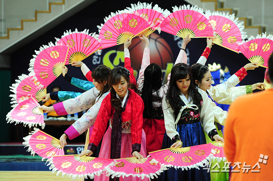 [엑스포츠뉴스=사진부 권혁재 기자] 9일 오후 안산 와동실내체육관에서 열린 'KDB금융그룹 2012-13 여자프로농구' 안산 신한은행 에스버드와 청주 KB스타즈의 경기에서 신한은행 치어리더들이 화려한 부채춤을 선보이고 있다.