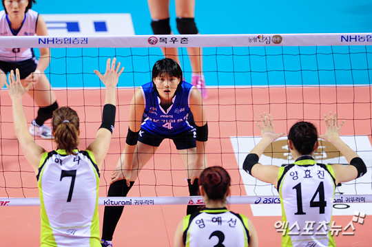 [엑스포츠뉴스=사진부 권혁재 기자] 10 오후 화성종합경기타운 실내체육관에서 열린 'NH농협 2012-2013 V리그' 여자부 화성 IBK기업은행 알토스와 수원 현대건설 힐스테이트의 경기에서 IBK기업은행 김희진이 수비 자세를 취하고 있다.