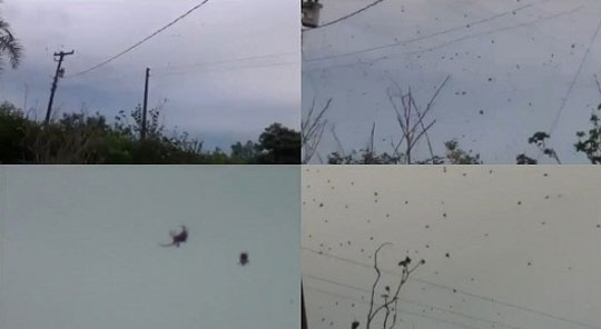 이 '하늘 덮은 거미 떼' 영상은 브라질 남부 산토 안토니우 마을에서 촬영된 영상으로 하늘에서 비처럼 내리는 모습을 보였다.